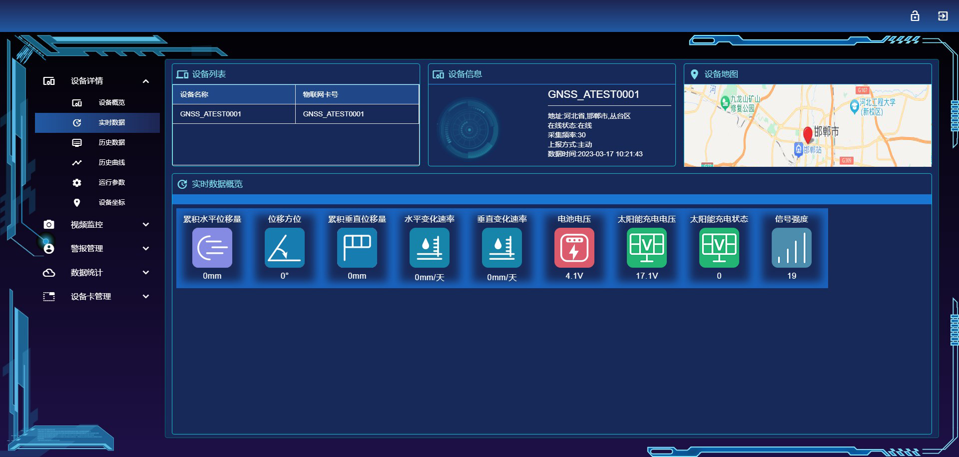 技术参数 | 设备参数 信号:GPS: LlC/A, L2C,北斗:B1I, B2I,GLONASS: L1OF, L2OF, Galileo: E1-B/C, E5b 单点定位精度:<1.5m RTK定位精度:水平∶±2.5mm 垂直∶±2.5mm 初始化可靠性:大于 99.9% 首次定位时间-电台方案:冷启动<30s 温启动<30s 热启动<30s 数据更新率:1Hz 数据格式:NMEA-0183 防尘防水:IP67级标准 功耗:小于2.5W 其他参数 ◇信号传输:4G无线数据传输、470MHz无线组网、RDSS北斗短报文通讯 ◇供 电:太阳能+锂电池组合供电 ◇工作温度:-40~85℃ ◇工作湿度:0~95%RH(非凝露) ◇太阳能板: 10W ◇锂 电 池:10.4Ah ◇上报间隔:1分钟~24小时可设置,支持密报 | |