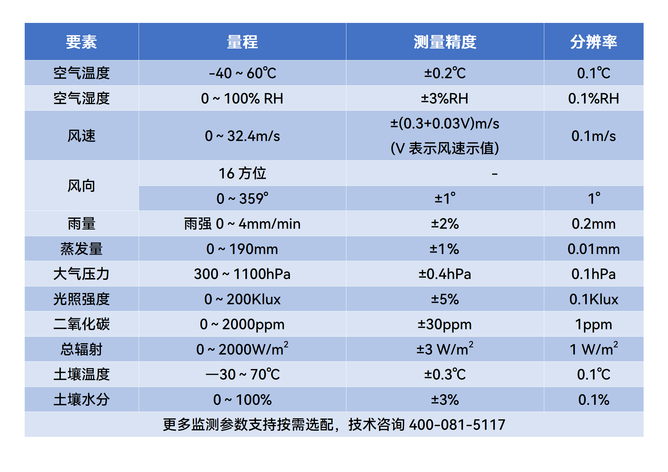 技术参数 测量参数 空气温度 空气湿度 ◇ 测量范围:-40℃~60℃ ◇ 测量范围:0~100% RH ◇ 测量精度:±0.2℃ ◇ 测量精度:3%RH ◇ 分 辨 率:0.1℃ ◇ 分 辨 率:0.1%RH 风 速 风 向 ◇ 基本原理:超声波原理 ◇ 基本原理:超声波原理 ◇ 启动风速:0.1m/s ◇ 测量范围:0~359° ◇ 测量范围:0~30m/s ◇ 分 辨 率:0.01m/s ◇ 测量精度:±1° ◇ 分 辨 率:1° ◇ 测量精度:±(0.2m/s±0.02*v)(v为真实风速) 总辐射 光 照 ◇ 光谱范围:400~1100nm ◇ 测量范围:0~200klux ◇ 余弦响应:≤5% ◇ 测量精度:±5% ◇ 精 确 度:±5%rdg+10dgts ◇ 分 辨 率:0.1m ◇ 线 性 度:±2% ◇ 量 程:0~2000W/m2 其他参数 ◇信号传输:4G无线数据传输 ◇供 电:太阳能+锂电池组合供电 ◇工作温度:-40~85℃ ◇工作湿度:0~95%RH(非凝露) ◇设备供电: 太阳能 ◇太阳能板: 10W ◇锂 电 池:DC7.4V 5200mA ◇工作电流:25mA 功能及特点 1. 采用超声波原理同时测量风速与风向,无机械运动,精度高,耐用性好,无启动风速限制,零风速工作,无角度限制; 2.观测参数齐全,可根据实际需要自由选配,并且各类传感器所采用的原理都较为先进,设备系统稳定,采集到的数据较为准确; 3.4G无线传输数据,无需架设通讯线路,传输距离远,传输效率高,能够确保数据的完整性和即时性; 4.太阳能+锂电池组合供电的供电方式,不仅可以避免架设供电线路的资源浪费和空间占用,还可以保证持续阴雨十余天的情况下不会出现断电的现象; 5.三节铝合金支架支撑,强度较高,且具有良好的抗蚀性,不易生锈,能够确保主机支架在使用过程中的使用寿命; 6.法兰底座安装,确保整体设备处于稳定的工作状态,减轻摇摆、晃动的幅度; 7.一体式精致外观设计,既美观、大方,又坚实、稳固,能适应各类观测环境。 适用范围 可被应用在农田种植、温室大棚、建筑工地、校园教育、城市街道、野外科考、科学研究等领域。 | ||